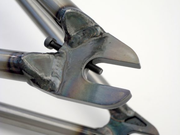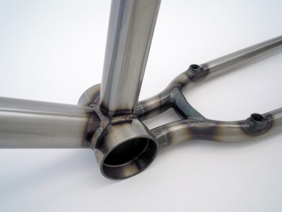 ヘッドチューブ角度は74.5度、トップとダウンチューブにはガセットプレートが付いてます。