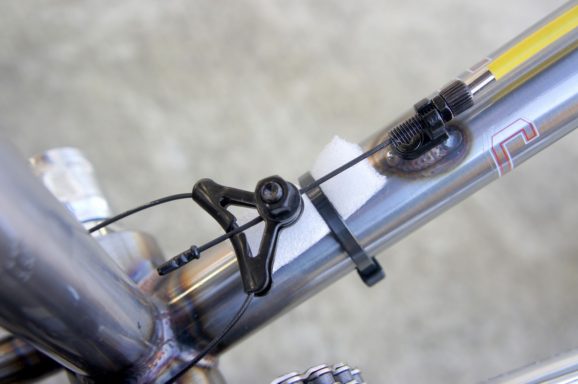チドリがフレームに当たってカチンカチンと音がするのが嫌なので、タイラップでスポンジを留めました。
