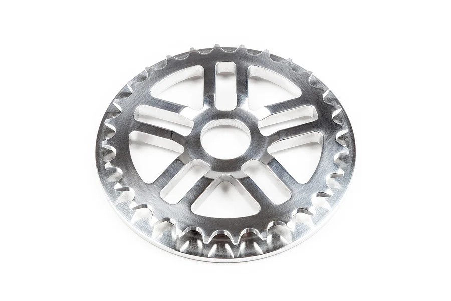 この画像は軽量化前のスプロケット、STRESS Discoguard Sprocket シルバー。デザインと26T という所が気に入ってたのですが180グラムと重めだったので、